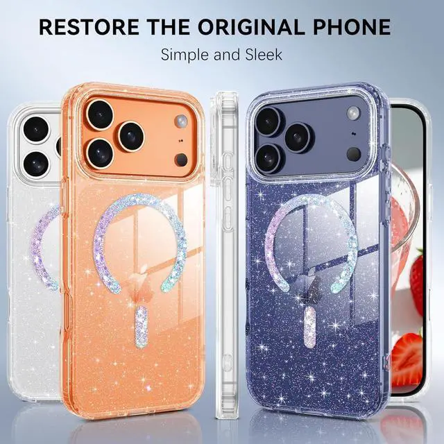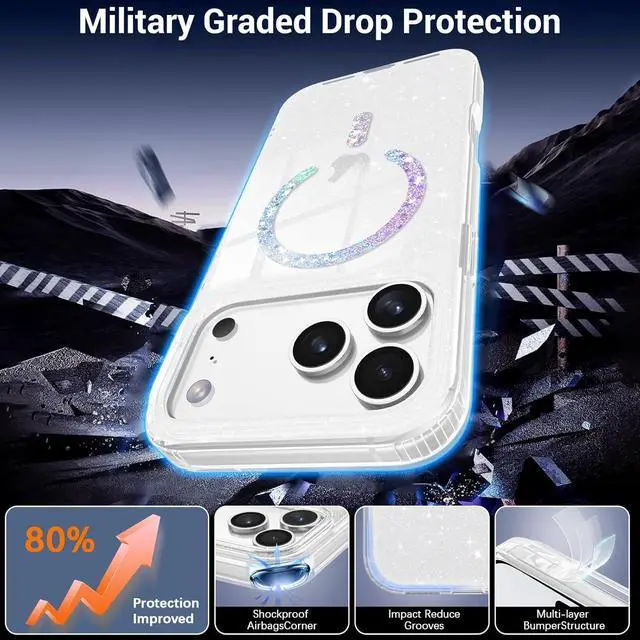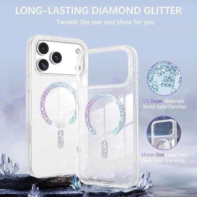 Perfect Compatibilityiphone 17 pro max case is compatible with iPhone 17 Pro Max 6.9 inch only! Not fit for any other phone models. We recommend using a wireless charger of more than 15W to ensure that your phone charges properly. Please note the screen protector is NOT included! Crystal Clear Glitter Designiphone 17 pro max case mag safe is designed with stylish transparent glitter detail to make your phone look beautiful and eyes-catching when you use it at any occasion. Bling sparkly glitter impressive visual effects long lasting glitter won't come off. Unique choice for woman girls and allows you to enjoy the amazing appearance of your phone.