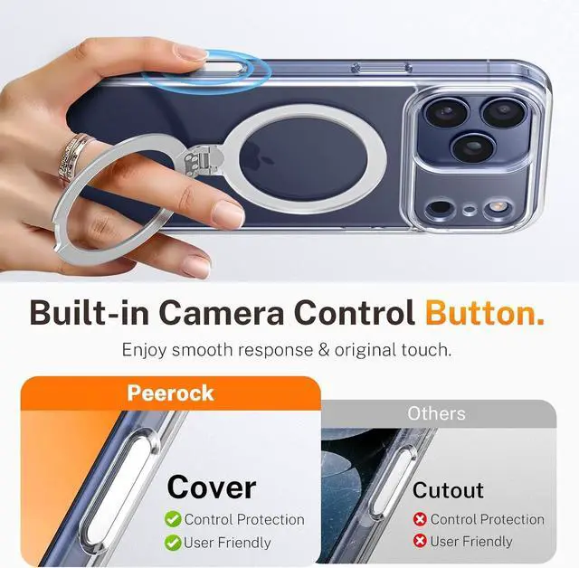 360° Spin Adjustable Stand This Peerock 17 Pro Max case features a built-in and non-removable kickstand that offers a wider range of viewing angles. Easily find the perfect view with 360° rotationit holds securely in both portrait and landscape orientations even standing completely upright 90° like using a mini-tripod. Made with better materials and a rock-solid construction the kickstand passed 30 000 cycles of rigorous testing for long-lasting sturdy and durable reliability3-in-1 Versatile Kickstand Stand ring holder and magnetic all-in-one! Its fixed rotating base keeps it from sliding. Whether closed and working with Mag*Safe accessories or unfolded as a triangular stand it remains completely stable and wobble-free.