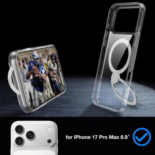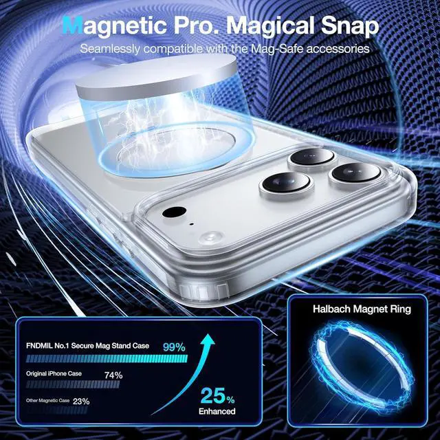 The adjustable angle of 0-140° allows for easy upright and horizontal support making it ideal for watching reels short films Facetime freeing your hands for a comfortable viewing experience. The folding area is upgraded with 316 stainless steel hinges which have been folded for 30 000 times to ensure they remain unbreakable and seamlessly closed. Magic Magnetic LockUsing cutting-edge Halbach Array technology and top-tier N52SH permanent magnets the magnetic adsorption force reaches an astonishing 5.7 lb. This iPhone 17 Pro Max Phone Case is seamlessly compatible with all the Mag-Safe accessories especially the Mag-Safe car mount.