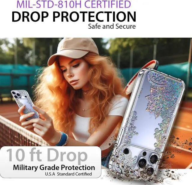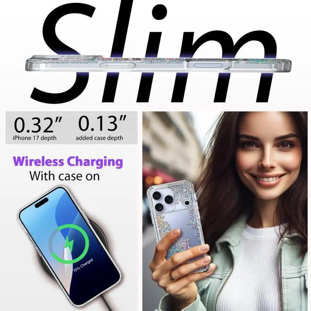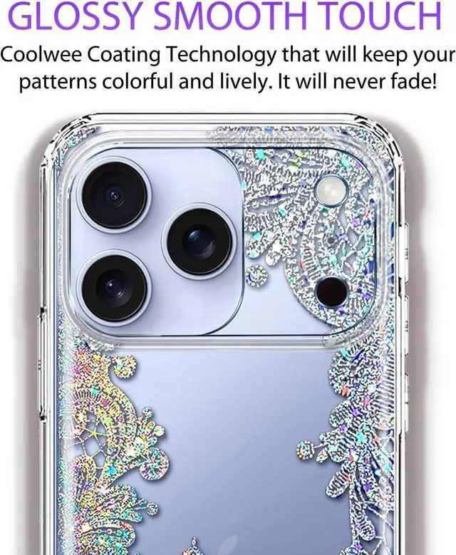 17 Pro Max Case with screen protector (1 x Premium Tempered Glass 9H anti-scratch); Case-Friendly design (Not edge to edge coverage as plastic protector so to avoid glass pushed off); Hybrid 10FT drop protective phone case is designed for iPhone 17 Pro Max 6.9 inch Only (2025 Release); Deisgn for MagSafe wireless charging without removing phone case (Only for Wireless and Other Powerful Qi-Certified Chargers; NOT for Magnetic Accessories); anti-slippery design; Anti finger print wipes clean easily[Anti Fingerprint; Slim Premium Shockproof Material Do not scratch your 17 Pro Max] Anti Fingerprint Wipes clean easily; Hybrid technology made of German imported anti-yellow Soft TPU bumper frame provide secure grip and hard plastic back cover protect from impact collision; Thin and Slim design preserve beauty of 17 Pro Max look; Anti Slippery avoids accidental drop; Premium German Bayer material makes anti yellow effectively resist stains and sweat over time keep vibrant and aesthetic[Shiny bling lace never fade] Beautiful metallic shiny glitter bling flower is inside of clear case never fade elegant more of iridescent sparkle in the sun or other light sources with reflection of your phone color eye catching aesthetic showcase your charming and individuality be the center of attention with this loopy glitter case for fashion women lady girls; looks cool and attractive with trend Henna; Different angle look white different Angle look silver due to sparkle bling finish[10FT MILITARY GRADE drop Protection 2 mm Raised bezel for screen and camera Protection] Enjoy thickness easy grip with Slim design protect with True 10FT MILITARY GRADE Drop Protection Certified by USA Standard (MIL-STD-810H); 2 mm Raised bezels offer protection for screen and Raised lips for each camera window provide camera lens drop protection against daily use chic and scratch when laid down on table; Slim thin Shockproof protective design with exra built-in 4 corners protectionTrust us give us Coolwee chance to serve you Backed by Coolwees 180-day warranty and responsive after sale support for total peace of mind; Snap on design is easy to install and remove; Precision Fit tactile buttons and accurate cutouts for speakers camera and ports ensure full access to all features with this 17 Pro Max cute case; Flaunts color of your phone to see through also add decorative flair; This clear phone case blends charm and function for a fashionable look