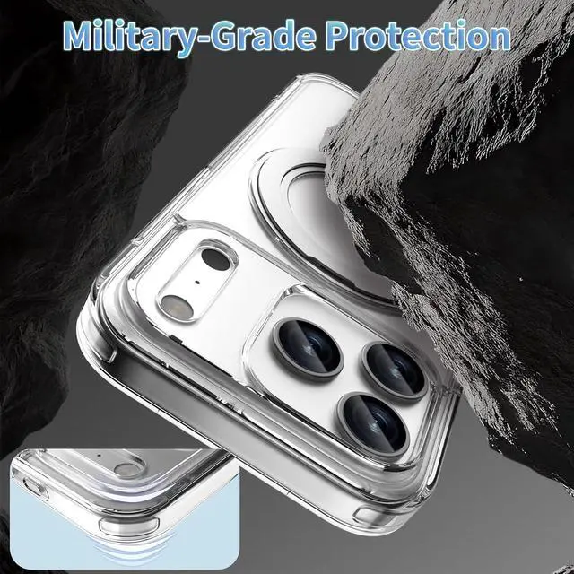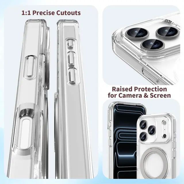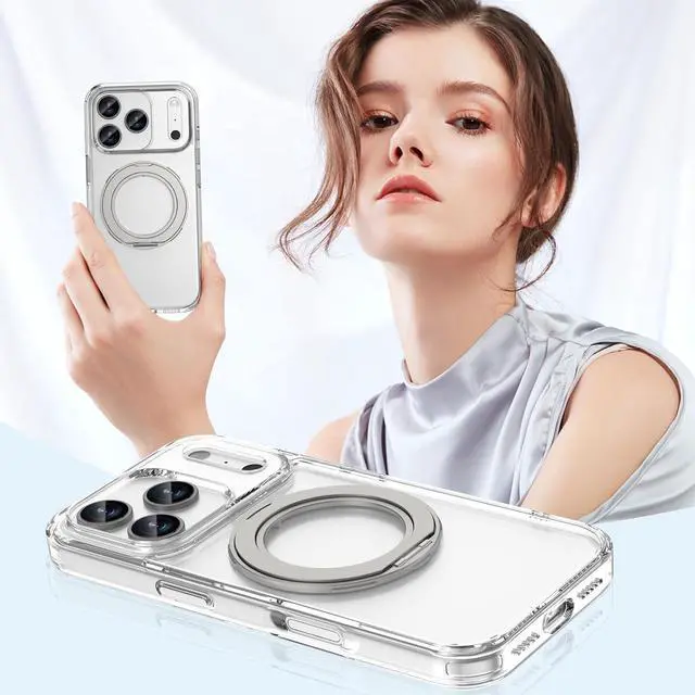 SizeCompatible with iPhone 17 Pro Max 6.9360 ° Rotatable Metal KickstandDurable aluminum alloy stand rotates smoothly for hands-free viewing at any angle. Beveled edges prevent scratching & ensure comfortable gripCrystal Clear & EverlastingAdvanced TPU material resists yellowing over time. 0.33 mm ultra-thin design maintains original phone aesthetics while providing waterproof protectionMilitary-Grade Protection 1.5 mm raised camera lip & reinforced corners guard against drops/scratches. Tested to withstand 6.6 ft dropsPrecision EngineeringLaser-cut charging ports & button covers ensure full functionality. Micro-dot texture provides non-slip grip without bulkiness