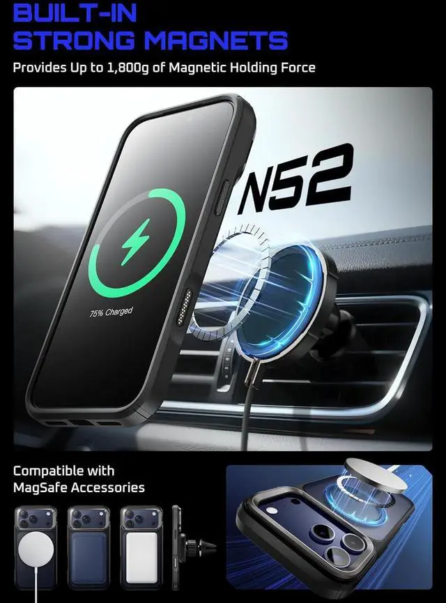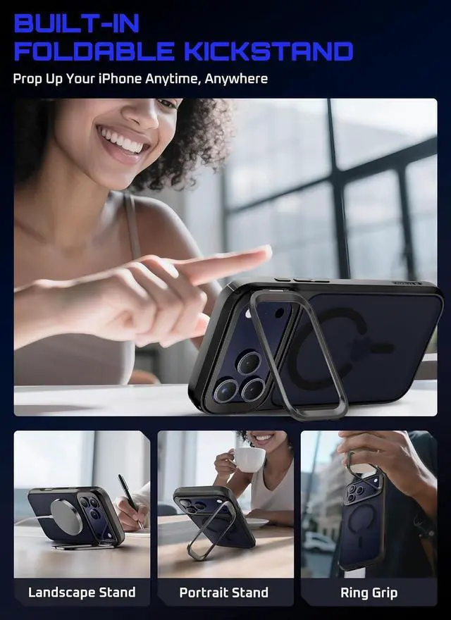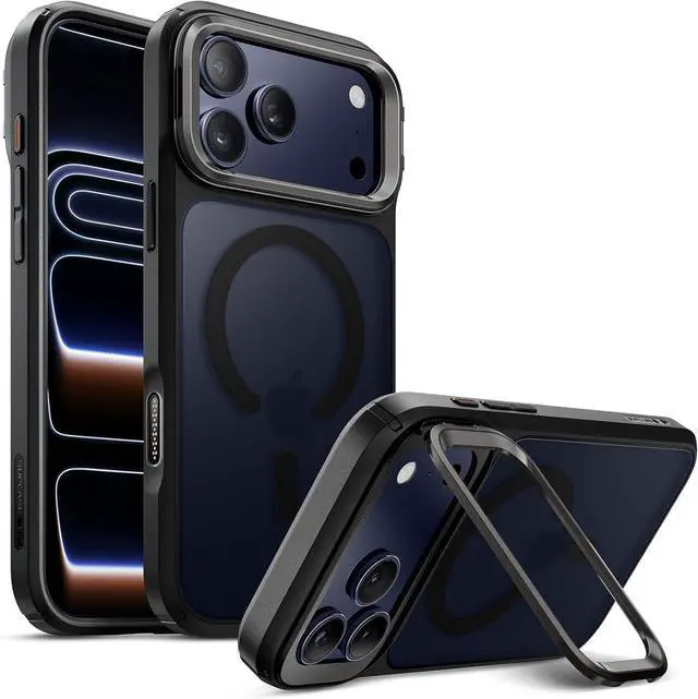 Enjoy hands-free viewing at the perfect angle. The versatile stand adjusts to multiple secure positions (landscape 0°60° portrait 30°) for comfortable viewing. A sturdy zinc alloy build and reinforced hinge ensure reliable support. Seamlessly integrated with the iPhone 17 Pro Max camera control functions it features 19 pure copper conductors that replicate the originals firm press and smooth swipe feel. Equipped with a powerful N52 magnet delivering up to 1800 g of magnetic force. The strong magnetic attraction ensures seamless compatibility with MagSafe accessories such as magnetic car mounts card holders wireless chargers and desktop charging stands.