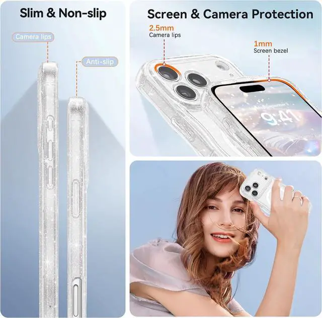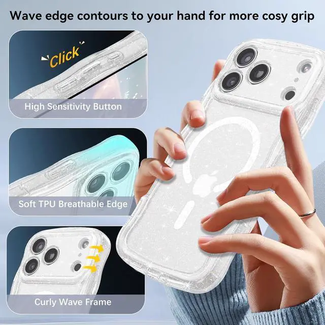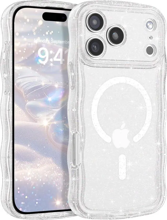 [ Compatible with iPhone 17 Pro Max ] This clear glitter case ONLY designed for iPhone 17 Pro Max 6.9 Inch. NOT FIT for any other smart phone models and WITHOUT the Screen Protector. [ Clear Glitter & Sparkle Design ] The case is made with high quality scratch-resistant transparent material maintaining the original beauty of your phone The embedded eye-catching glitters will never flake off and stay bling making your phone more attractive and fashionable. [ Unique Wave Edge Design ] This for iPhone 17 Pro Max case Featuring a charming wavy bezel this glitter phone case adds a touch of elegance and style.