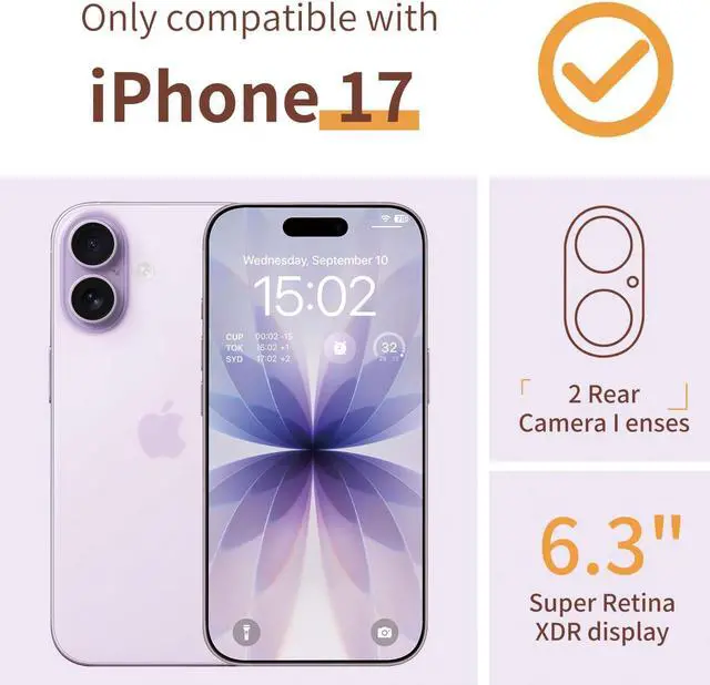 Package Includes Phone CaseTempered Glass Screen Protectors Camera Lens Protectors and Installation Tool. ONLY compatible with iPhone 17 ( 6.3 inch screen size)Crystal