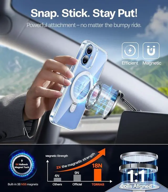 Stand Snap Pro: We get it busy days demand efficiency. TORRAS iPhone 17 Case magnetic has a built-in N52 magnet array 2X stronger suction than regular. So powerful and precise snaps onto magsafe accessory with a satisfying click. Charge wirelessly at full speed without removing it or secure to your car vent mount for hands free navigation on chaotic L. A. freeways. Holds tight through bumps/turns no drops or constant adjustments. Quick stable convenience for your on-the-go lifeShield