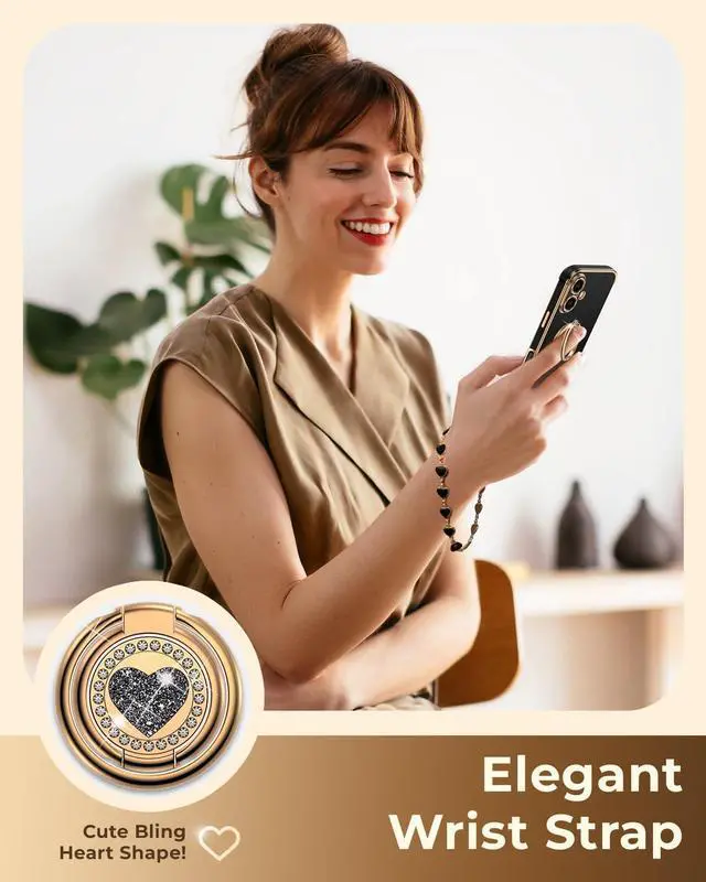 ? Compatible ModelsThe Case for iPhone 176.3 inch Only.?? 2-Way 360° Ring Stand This case for iPhone 17 features a heart-shaped ring that can fold 180° and rotate 360°. This dual-ring stand supports both portrait and landscape mode with multiple adjustable angles. It's sturdy and provides convenience when reading browsing watching movies or Facetiming.?? Cute and Timeless DesignWith a gold electroplated edge a heart shape engraved ring kickstand and a mini-hearts wrist strap chain this case adds elegance and charm to your phone. It's a perfect representation of your taste for luxury and style.