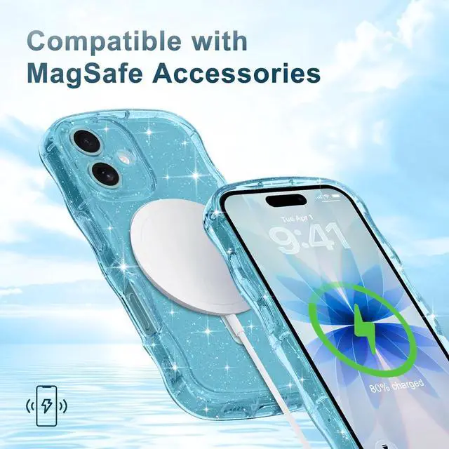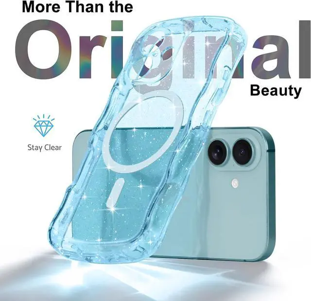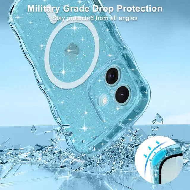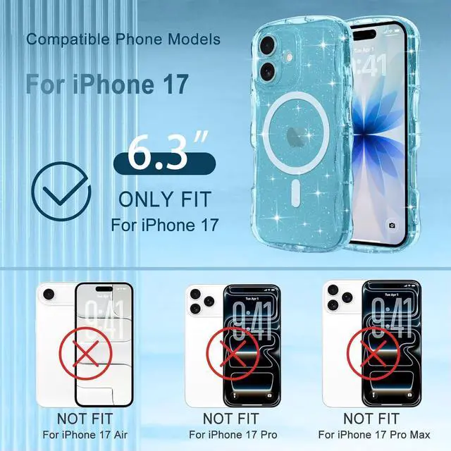 • Magnetic for iPhone 17 Case Clear Sparkly Bling Glitter Cute Curly Wave Transparent Cover for Women Men Compatible with MagSafe TPU Shockproof Protective Phone Case for iPhone 17 Blue