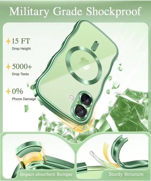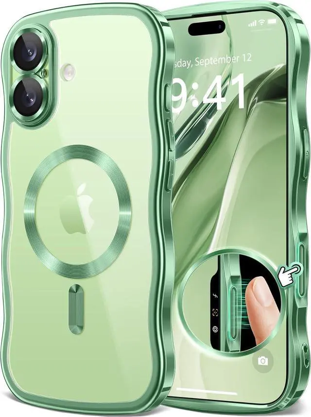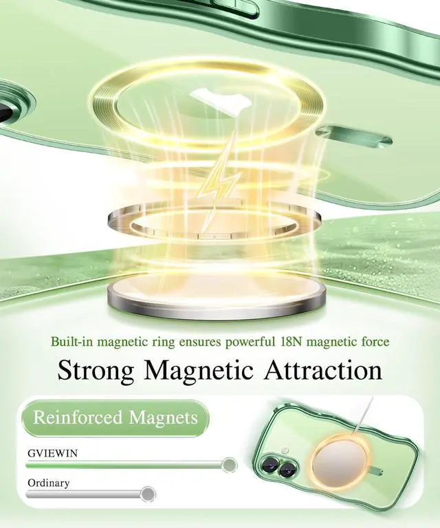 • GVIEWIN for iPhone 17 Case [Compatible with MagSafe][Upgraded Full Camera Protection][Cute Wave Frame] Plating Slim Shockproof Protective Magnetic Phone Case for iPhone 17 6.3 (Clear/Green)