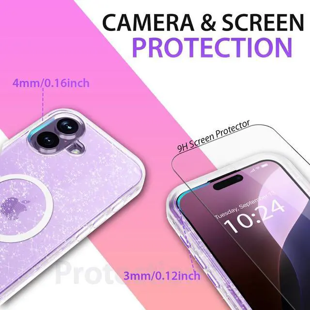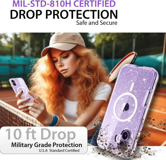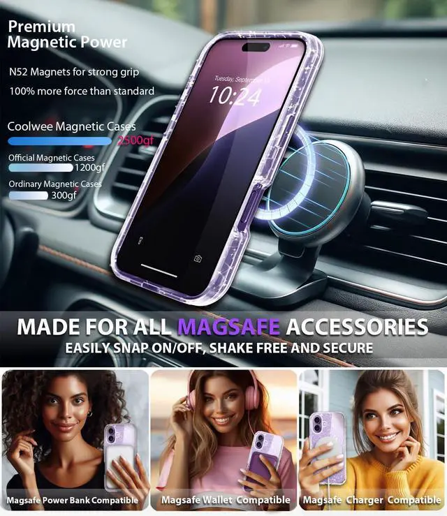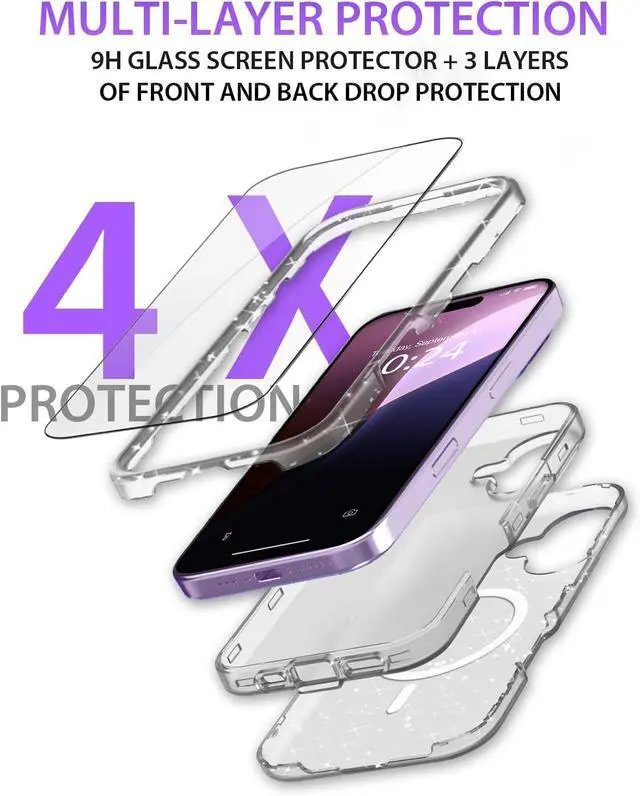 features 3-layer hybrid full protection design True Military-grade Drop Protection Certified by MIL-STD-810H with 3 mm Raised Bezel for screen and Camera 3.5 mm thick; Clear glitter design is specifically made for iPhone 17 6.3 inch (2025) Fit for MagSafe and support wireless charging; Not for other similar phone model name could you please identify phone model name to fit correct size phone case; Anti finger print wipes clean easilyFull Body Protective including a Separate Tempered Glass Screen Protector (Case Friendly putting it on make phone screen coverage); Full front and back coverage protect phone from Drop impact and shock; 3 layers Hybrid Full Protection case made of solid Plastic hard shell (Front and Back cover) and Clear Transparent soft interior TPU layer with Bling Glitter Looking; 3 layer design provide triple shockproof drop protection is durable and protective for iPhone 17Compatible with Magsafe accessories Secure lock on fit for Magnetic Car mounts; Premium Magnetic phone case Top Grade Stronger N52 magnets integrated powerful built-in magnets deliver ultra-strong 2 500gs magnetic force for stable attachment Keeps your phone firmly in place during daily use and travel; Reinforced magnetic connection ensures faster safer wireless charging; The high quality magnetic ring perform thousands of hours of durability testing never fade never rip off over timeGlitter do not fall off or scratch your fingers; Shockproof Protective Case is durable comes with Design of Glitter Sparkle for charming girls women; Heavy Duty Protection case looks cute and attractive with fashion trend bling finish for iPhone 17 case for women Girls; Flaunts original color of your phone to see through also add decoration on clear cute Phone case2nd generation of reinforced Large cut-out design fit most of cables precise cutouts easy to access and press all buttons ports and Camera; Please putting on the soft silicone layer first adjusting layer in right place and then snapping on the hard case; Trust us give us Coolwee chance to serve you Backed by Coolwees 180-day warranty and responsive after sale support for total peace of mind