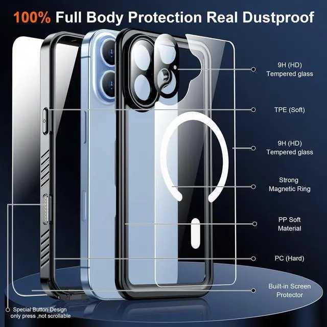 Washable design ensures easy cleaning and keeps your phone and case always stay clean (Note: Please make sure all of the plugs are sealed before using)Real 360° Full Body ProtectionCertified MIL-STD 12ft drop test and full protection prevents your device from damage. 360°full sealed ensures no dusts and dirt enter the case protects your phone from scratches and fading. Made with flexible rubber back cover and hard inner cover provides shockproof and anti-drop protection and daily wear and tear. Built-in Camera & Screen ptotectorBuilt-in camera lens protector offers well protection for your valued phone cameras and also provides high quality picture capturing. It can prevents scratches water oil and dust. Keep your phone lens in HD transparent and clear all the time. Wtih built-in screen protector this case can prevent the phone screen from scratches as well as provides a sensitive touch and ensures a quick response bring you a great touch experience. Camera ControlSoft and sensitive buttons with good response are easy to press. Button design provides presice position and sensitive response it completely compatible with iPhone's camera button through press swipe and click for quickly achieve the original function ensuring a seamless experience.