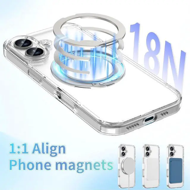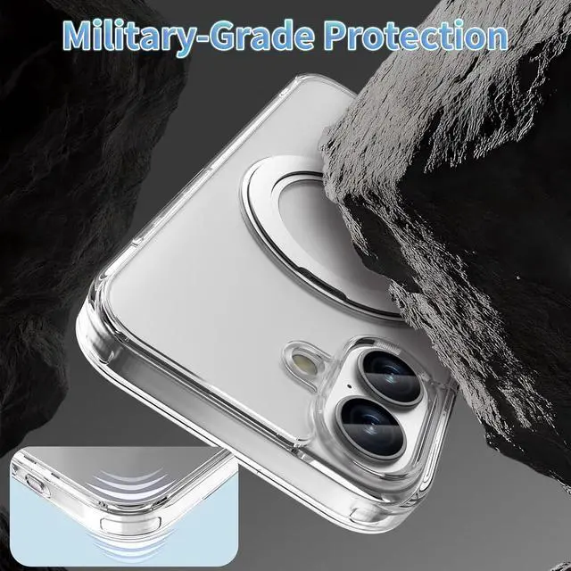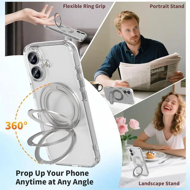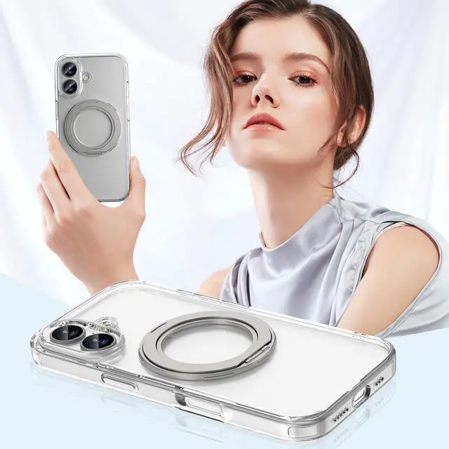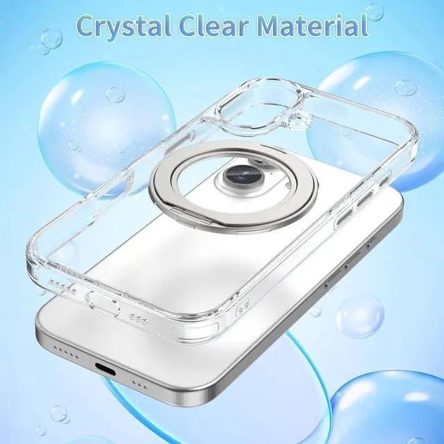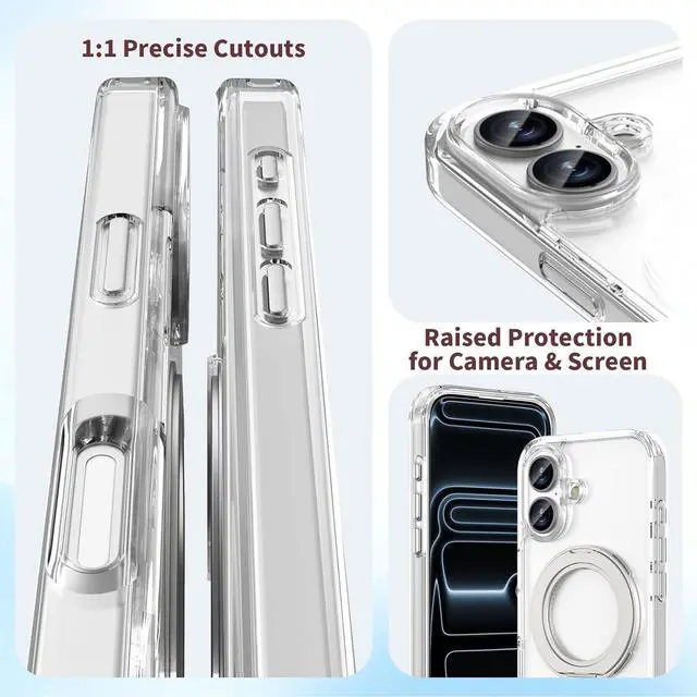 SizeCompatible with iPhone 17 6.3360 ° Rotatable Metal KickstandDurable aluminum alloy stand rotates smoothly for hands-free viewing at any angle. Beveled edges prevent scratching & ensure comfortable gripCrystal Clear & EverlastingAdvanced TPU material resists yellowing over time. 0.33 mm ultra-thin design maintains original phone aesthetics while providing waterproof protectionMilitary-Grade Protection 1.5 mm raised camera lip & reinforced corners guard against drops/scratches. Tested to withstand 6.6 ft dropsPrecision EngineeringLaser-cut charging ports & button covers ensure full functionality. Micro-dot texture provides non-slip grip without bulkiness