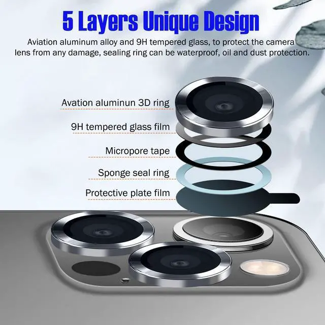 Anti-Drop, Anti-Scratch and Anti-Vibration Protection The aviation aluminum metal ring and 9H tempered glass camera protector resist your iPhone 13 Pro/13 Pro Max from huge impacts and drops from external forces. The seal ring is designed to provide water, oil, and dust protection for your phone's lens.