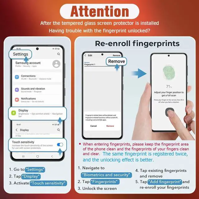 Steps: Setting-Display-Touch the sensitivity switch3Press outwards around the fingerprint recognition ring to ensure no bubbles, and After pasting the tempered film, re-enter the fingerprint to unlock more sensitively (IMPORTANTLY) 43D Surface Full Coverage Screen Protectors, Case Friendly with most phone cases 5: 9 H hardness tempered glass that can powerfully resist wear & scratches, impact & drop; offering durable protection to your Galaxy S22 Ultra.