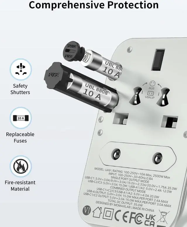 [Comprehensive Safety] This universal outlet adapter is equipped with a replaceable 10A overload fuse to cut off the current in time when the current is too high. Inside the adapter, we have also prepared an extra spare fuse for you to save the cost of purchasing fuses. Safety shutters, plug lock system and multiple protection measures are also present in this adapter.