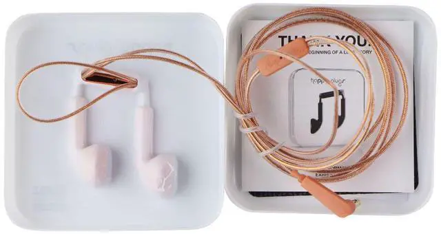The Happy Plugs 3.5mm Wired Earbud Headphones with Mic and Remote. Rose Gold version. Model: (7737)