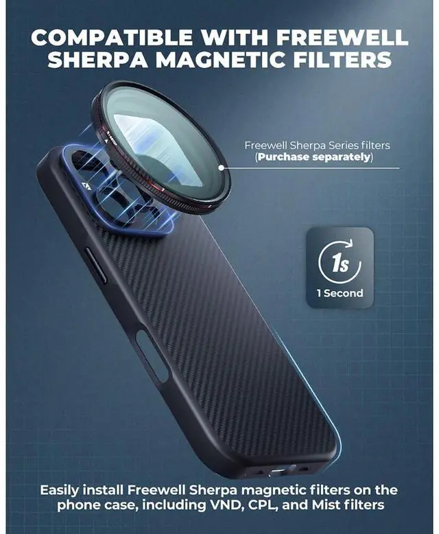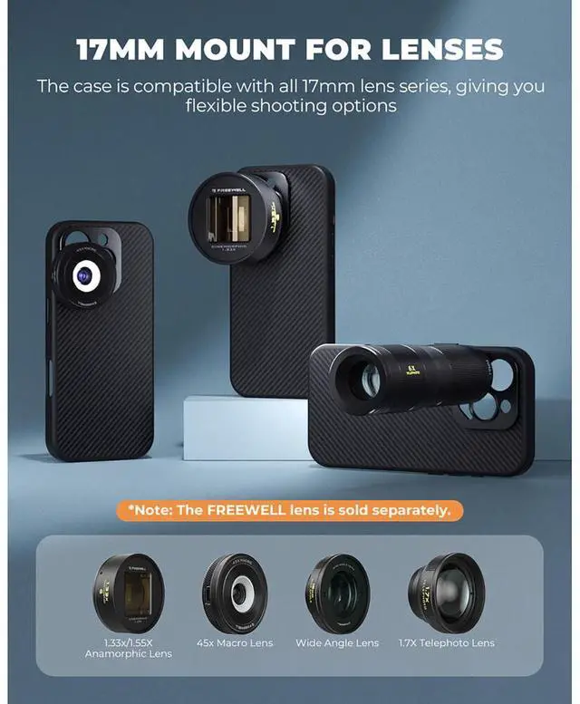 Make your iPhone 13 Pro the ultimate tool for photography and filmmaking with the Freewell Pro Filmmaker Case. This innovative case is designed to enhance your creative capabilities with its Magnetic Filter Mount, allowing you to effortlessly attach Freewell Sherpa Magnetic Filters. These filters are perfect for elevating your phone's photography and videography, providing you with professional-grade results. The case features a 17mm Lens Compatibility, equipped with a 17mm mount slot that is ideal for connecting a wide range of compatible lenses. This feature expands your creative toolkit, enabling you to capture stunning visuals with ease.
