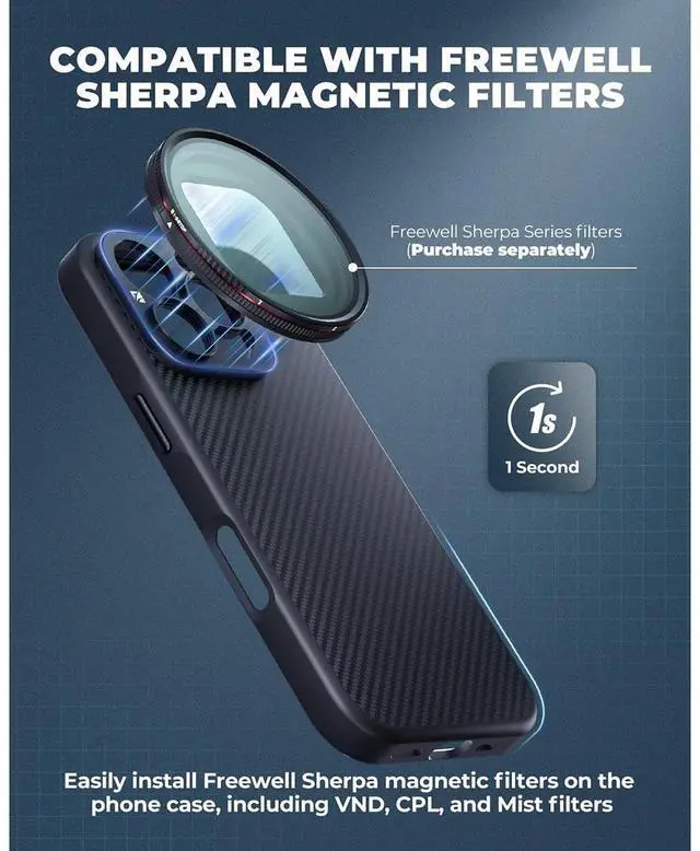 Whether you're shooting wide-angle landscapes or detailed close-ups, this case provides the tools you need to elevate your visual storytelling. Optimized for MagSafe, the Freewell Pro Filmmaker Case is fully compatible with MagSafe charging systems and accessories. This ensures that you can charge your device wirelessly without removing the case, maintaining convenience and efficiency in your daily routine. Designed with a non-slip grip, this case ensures a secure and comfortable hold, reducing the risk of accidental drops while providing robust protection for your device. Its ergonomic design is tailored for filmmakers and photography enthusiasts who are eager to enhance their smartphone's camera capabilities.