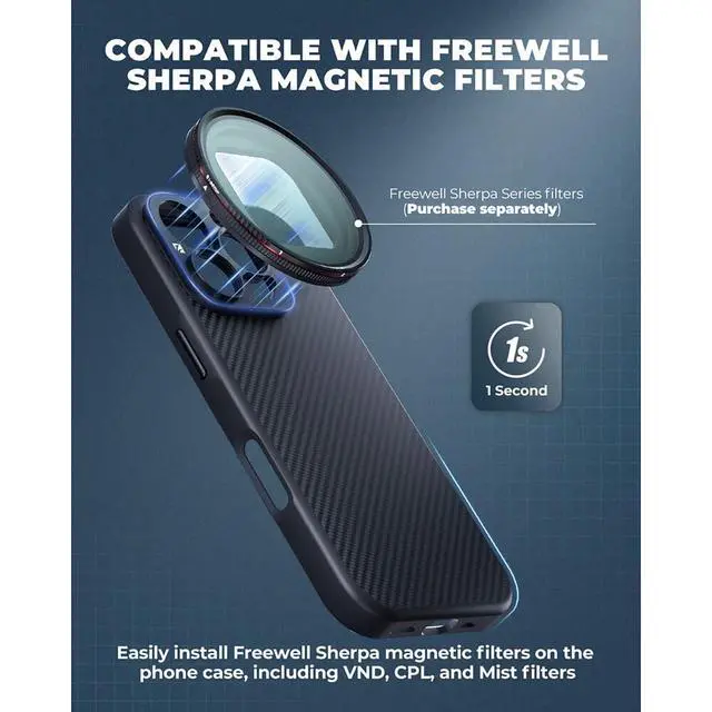 Before diving into your next creative project, equip your iPhone 15 Pro with the Freewell Pro Filmmaker Case, designed to elevate your mobile filmmaking experience. This innovative case allows for effortless filter attachment, featuring Freewell's magnetic system that lets you seamlessly add and switch out filters to enhance your creative shots with ease. Whether you're capturing breathtaking landscapes or dynamic action scenes, this case ensures your footage is always top-notch. The Freewell Pro Filmmaker Case is engineered with a 17mm lens mount compatibility, supporting a wide range of 17mm lenses. This feature provides filmmakers with the flexibility to experiment with diverse shooting styles, from wide-angle to telephoto, ensuring you have the right lens for every scene.