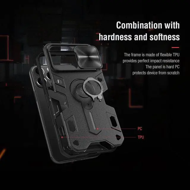 Case: Brand NILLKIN Compatibility For Apple Compatible Model For iPhone 13 Pro Material TPU+PC (Soft+Hard) Feature Slide Camera Cover / Accurate Cutouts / Armor / with Bracket Function Camera Protection / Anti-Fingerprint / Anti-Scratch / Shockproof Type Back Cover Color Black Package Included 1* Protective