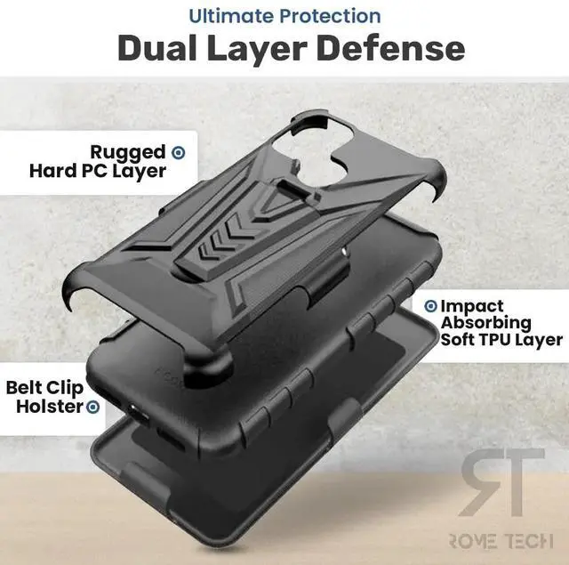 Rome Tech Dual Layer holster case for Coolpad Suvaoffers two layers of rugged protection while maintaining a slim profile and feature-rich design. The inner soft TPU layer has a textured pattern for a better non-slip grip. The outer hard polycarbonate PC layer has a unique design that provides excellent protection against drops, scratches, and bumps. Raised beveled edge keeps your touchscreen and camera lens safe from scratches. A foldable kickstand is perfect for video calls and media playback.