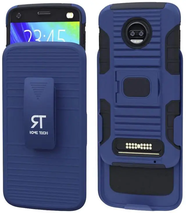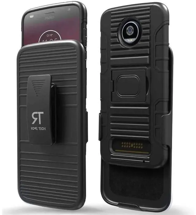Rome Tech Dual-Layer Holster Case Kickstand for Motorola Moto Z2 Play offers two layers of rugged protection while maintaining a slim profile and feature-rich design. This case is compatible with magnetic mounts and has a built-in magnetic plate on the back. The inner soft TPU layer has a textured pattern for a better non-slip grip. The outer hard polycarbonate PC layer provides excellent protection against drops, scratches, and bumps. Raised beveled edge keeps your touchscreen and camera lens safe from scratches. A foldable kickstand with a built-in finger loop is perfect for video calls and media playback.