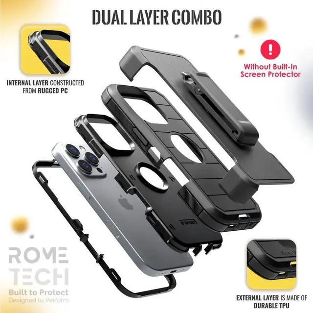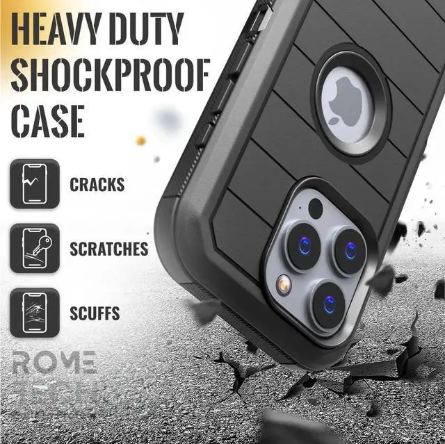 Protective Cases for Apple iPhone 16 Proa is four layers of 360-degree heavy-duty shockproof protection. Our defender series case is made out of durable materials with a hard polycarbonate inner shell and soft outer rubber layer. Raised beveled edge keeps your touchscreen safe from scratches. A 360-degree swivel belt clip also functions as a kickstand with different viewing angles perfect for video calls and media playback. Defender series also have easy access to the charging port, buttons, sensors, and camera. Built-in port covers offer protection from dust, dirt, and other elements, making it ideal for commercial use. Rome Tech's Defender series multi-layer design offers rugged drop protection ideal for outdoor adventures, sports, hiking and guards your device against scrapes, bumps, dirt, and dust.