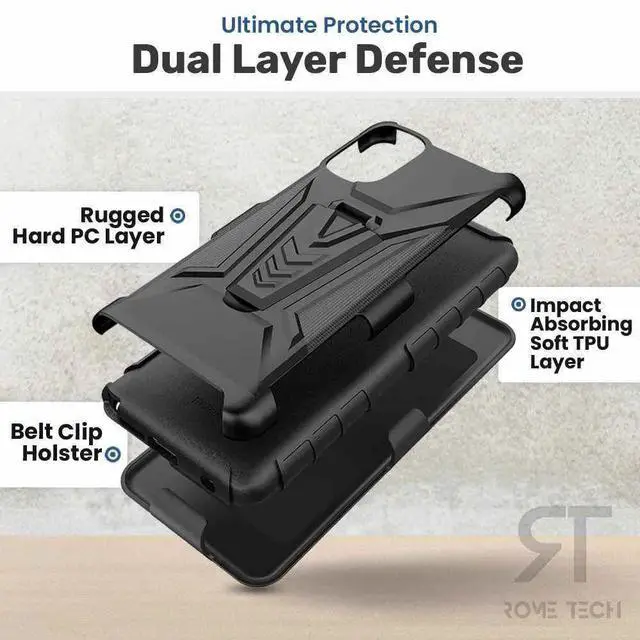 Rome Tech Dual Layer holster case for Apple iPhone 14 Prooffers two layers of rugged protection while maintaining a slim profile and feature-rich design. The inner soft TPU layer has a textured pattern for a better non-slip grip. The outer hard polycarbonate PC layer has a unique design that provides excellent protection against drops, scratches, and bumps. Raised beveled edge keeps your touchscreen and camera lens safe from scratches. A foldable kickstand is perfect for video calls and media playback.