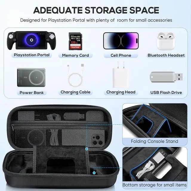 Large Capacity Storage --- Unique grooves designed to fit for PS Portal securely, hold the console in bag without wobbling. Includes a spacious mesh pocket and additional storage space at the bottom, allowing you to store various gaming accessories and keep them organized. Made of high-quality EVA for excellent shock and pressure resistance, soft lining prevents any scratches to the console.