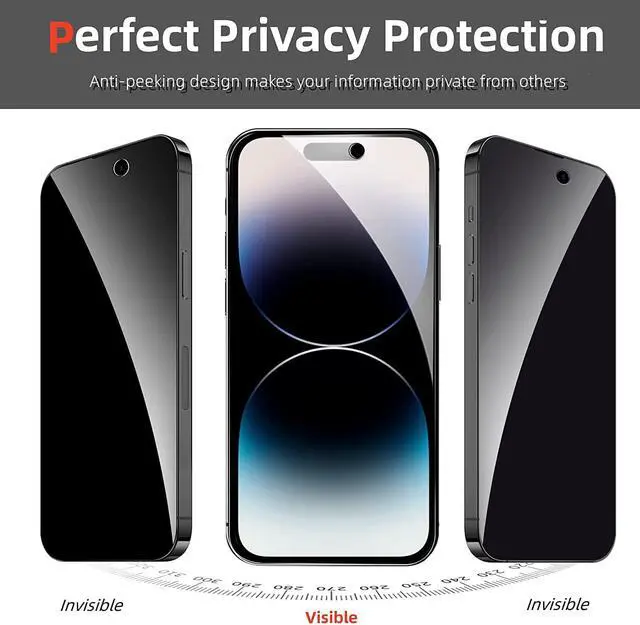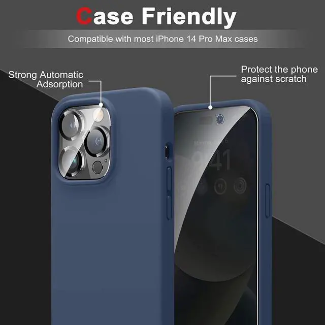 Works for iPhone 14 Pro Max Only Designed for iPhone 14 Pro Max, 2 packs of privacy screen protector and 3 packs of camera lens protector included, protecting your phone screen privacy (only visible within 28 degrees). Meanwhile, 9H hardness tempered glass can protect your phone screen and camera lens from scratches, shattering and impact