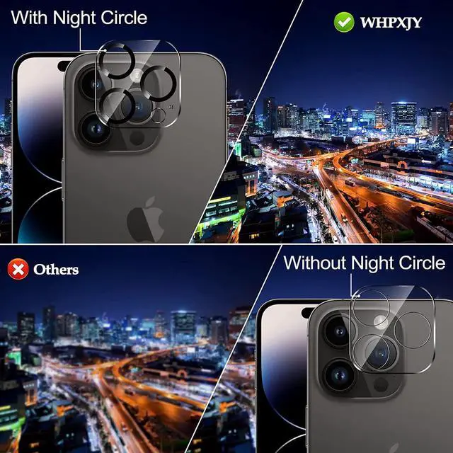 Ultra HD & Night Circle & Strong Adhesion Designed with night circles, the upgraded iPhone 14 Pro Max camera lens protector does not interfere with shooting in dark environments, restoring the original clarity of the taken photos and videos, while the strong adhesion of the lens protector keeps it firmly on the lens