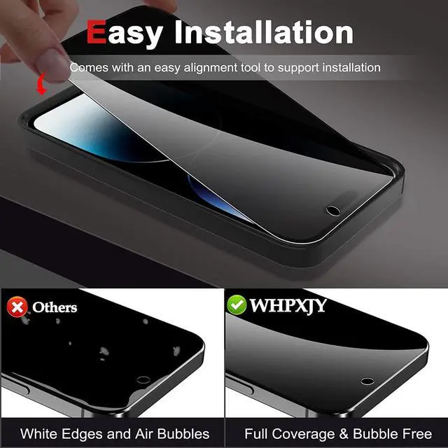 Easy to Install & Case Friendly Comes with an easy alignment tool to assist installation in seconds, no air bubbles and dust left behind, not easy to peel off. Precise laser cut tempered glass makes the iPhone 14 Pro Max screen protector privacy glass and iPhone 14 Pro Max camera protector fit your iPhone perfectly, leaving extra space for most iPhone cases on the market