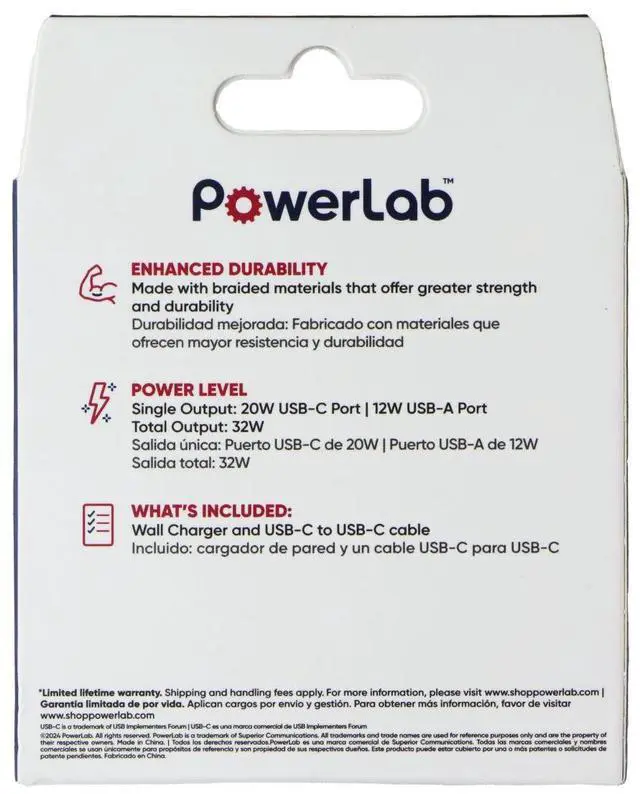PowerLab 32W Wall Charger and 6-Ft USB-C to USB-C Cable. White and Silver color design.