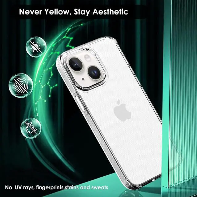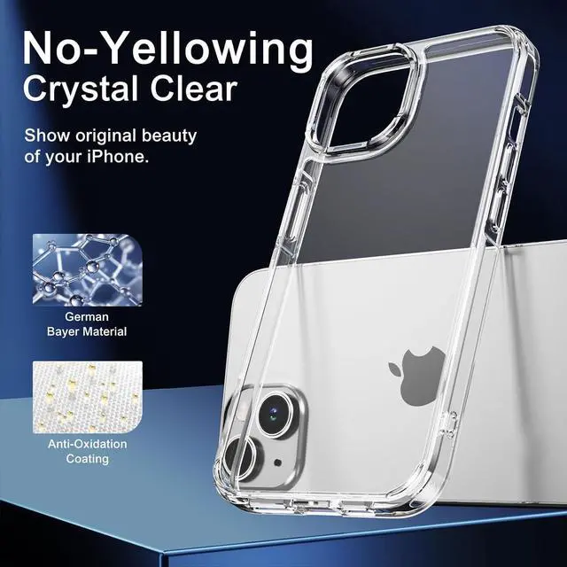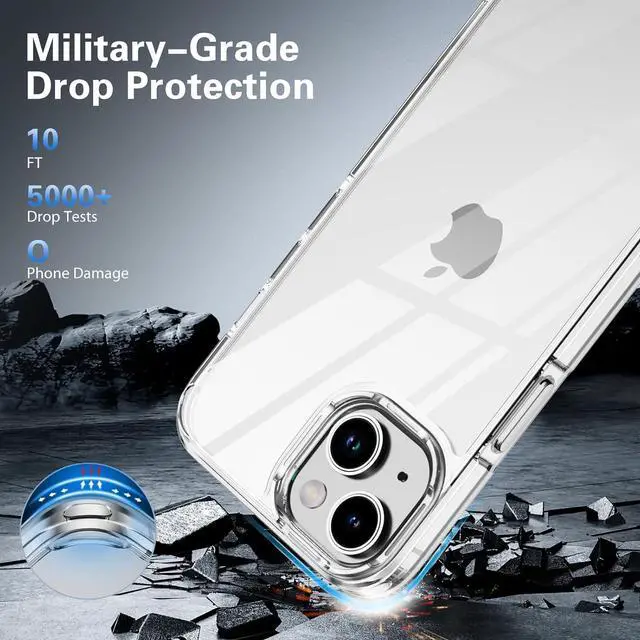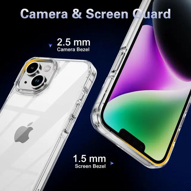 • 2.Full ProtectionAdopting durable hard PC back and soft TPU bumper, special designs with corner airbag and raised corner bezels of 2.5 MM, the clear iPhone 14 case survives under condition of 8000+ drop tests up to 10 FT, and prevent screen and camera from scratches & sliding, and full protection of all sides without bulky.