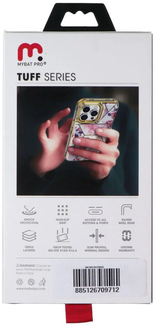 The MyBat Pro Tuff Series Case for Apple iPhone 14 Pro Smartphones. Pink Marbling / Gold Electroplating.