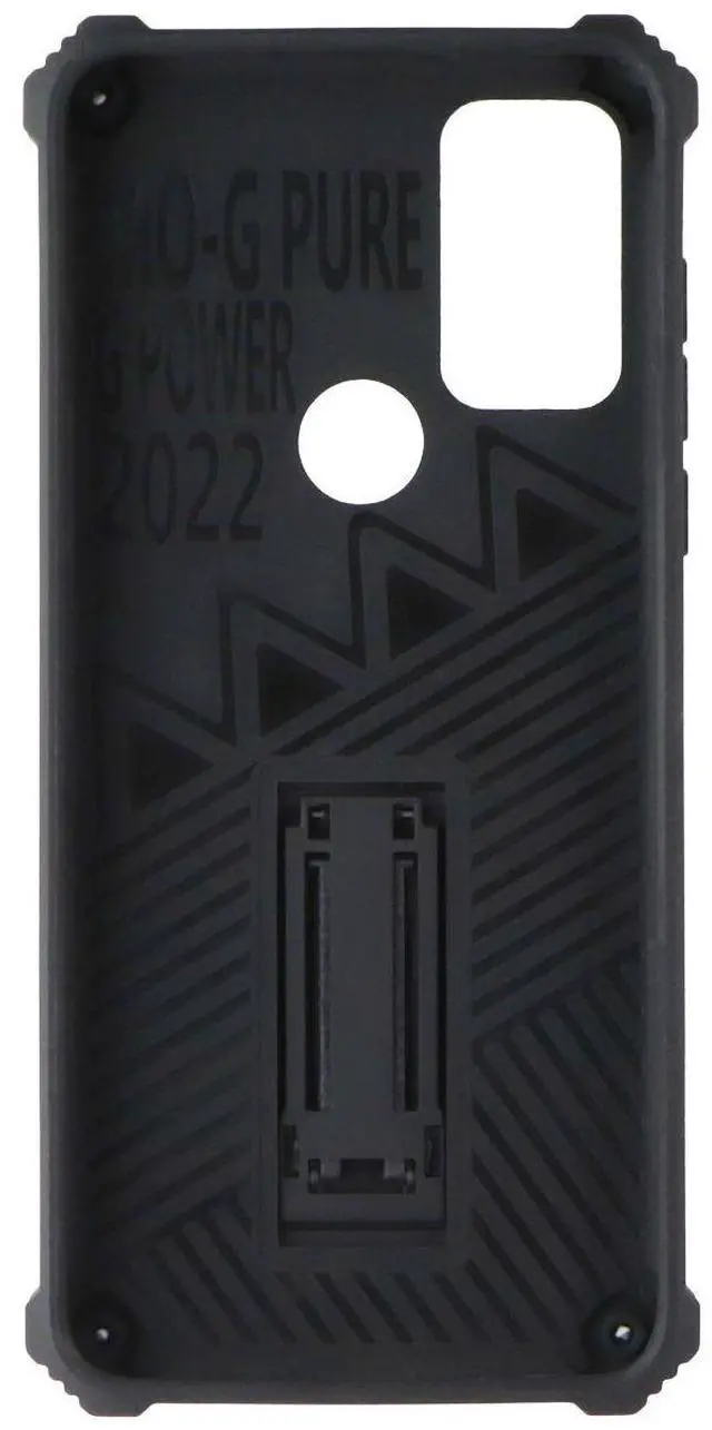 The MyBat Sturdy Hybrid Case with Kickstand for Motorola Moto G Play (2023). Black version.