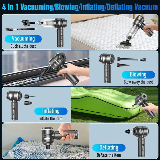 YKSINX portable vacuum cleaner comes with 7 accessories, not only as dust buster helps to keep home, office, car clean and tidy, but also as air duster to clean dust, at the same time as air blower to pump and inflate!