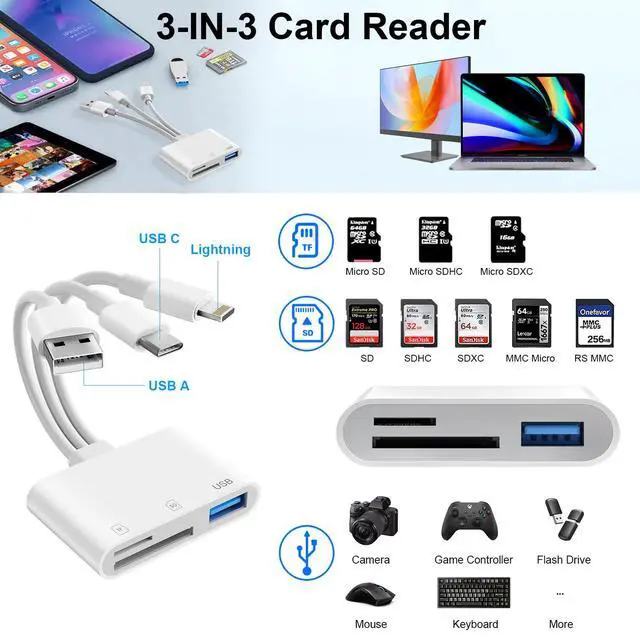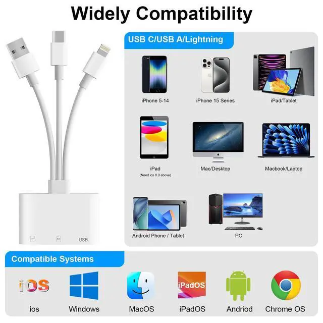 USB A & Lightning & USB C 3-IN-1 design is a prefect camera adapter for Apple all device (such as iphone/ipad/macbook). Additionally, it is compatible with other USB-C devices as well as laptops and pc computers.