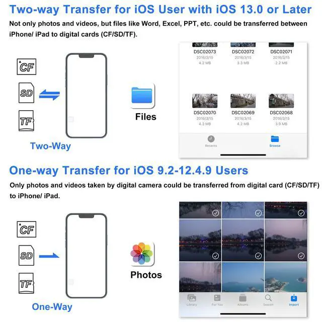With this reader, it is easy to view/save/delete/share photos and videos from your SD/TF/CF card to your phone and pad, so you can view and share them with family and friends anywhere anytime.