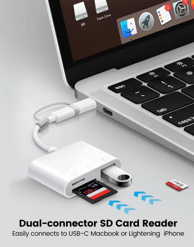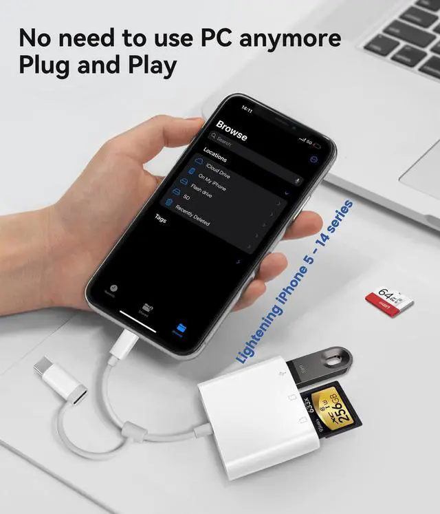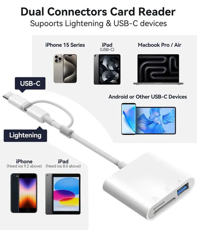 The inclusion of both a Lightening cord card reader and a USB-C to lightening adaptor, ensuring compatibility with almost all your gadgets, from iPhone 5 - 14 to your USB-C iPhone 15, 16, iPad, Mac, Laptop or other devices.