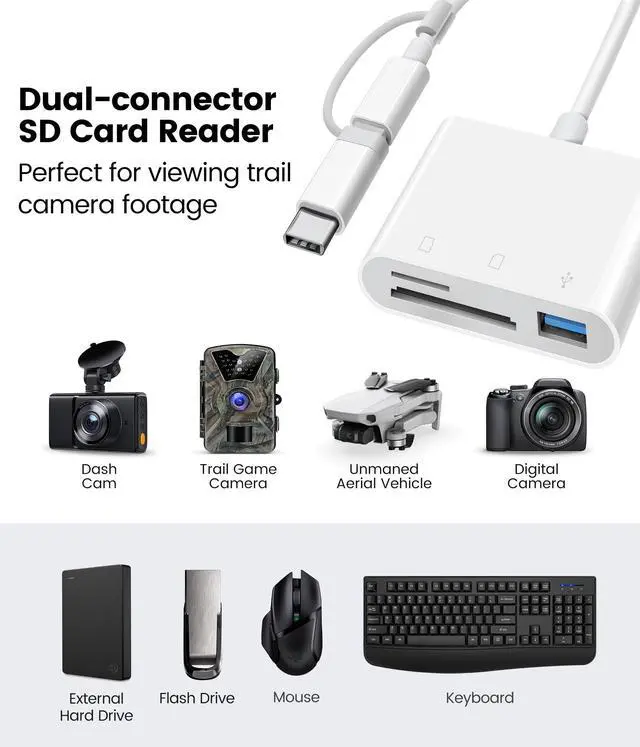 Supports standard USB OTG devices, compatible with a variety of digital cameras, trail cameras, flash drives, keyboards, mice, hard drives and more.