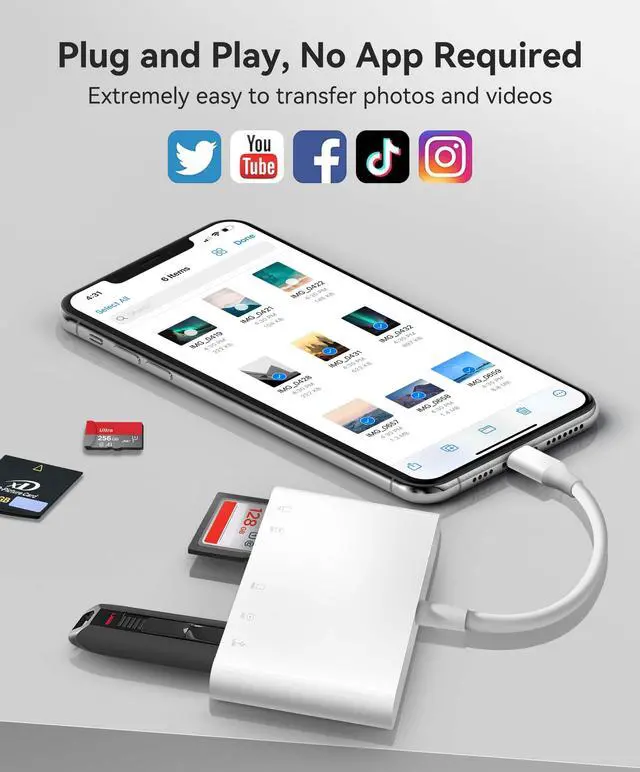 DESIGNED FOR PHOTOGRAPHY CREATORS: The AkHolz SD card reader is a photography accessory for KODAK Canon Nikon DSLR digital hunting trail cameras. No third-party apps required. Plug in your iPhone 15 and use iOS built-in Photos to import photos videos with one click. Or use the iOS built-in Files to import and export any files.