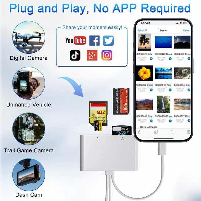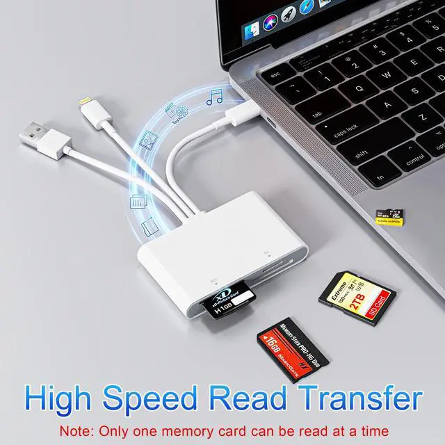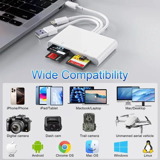 Triple Connector Design: This Sony memory stick pro duo adapter compatible with USB-A, USB-C and Lightning ports. Simply plug the USB-C connector into devices like iPhone 16 , iPad Pro, Mac, Android phones, or PCs, or attach the Lightning adapter for older Apple devices. The USB A port support more PCs. This versatile setup enables seamless cross-platform data transfers move photos, videos, and files between iOS, Android, Windows, and macOS systems with full OTG support.