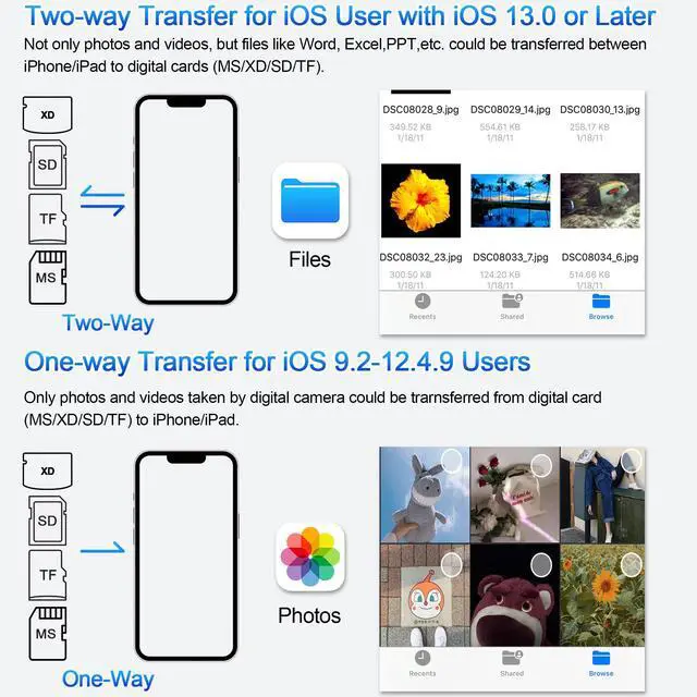 Two-way Transfer: Two-way transfer suitable for iOS 13 -18 device. Import data from XD/MS/SD/TF card to iPhone/iPad, or transfer the file from iPhone/iPad to XD/MS/SD/TF card. Include Movies, Music, Word, Power point, Excel, PDF, etc.