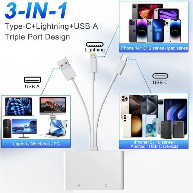 The 3-in-1 plug Lightning, USB C and USB 3.0 are compatible with more devices, allowing you to quickly view photos and videos on your phone and computer. The most popular 3-in-1 design this year!