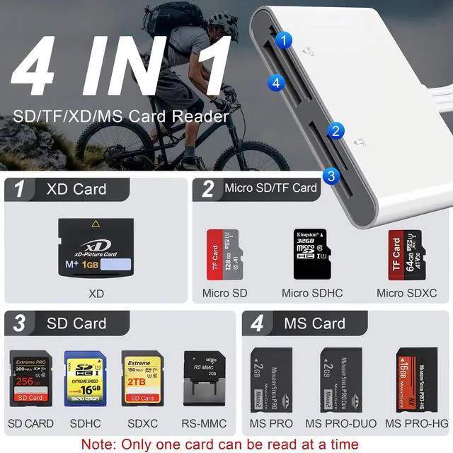 This sd card reader with SD/ TF/ MS/ CF/ XD card slots, supports a wide range of memory card formats, including XD, SDXC, SDHC, SD, MS, Micro SDXC, Micro SDHC, and Micro SD cards.