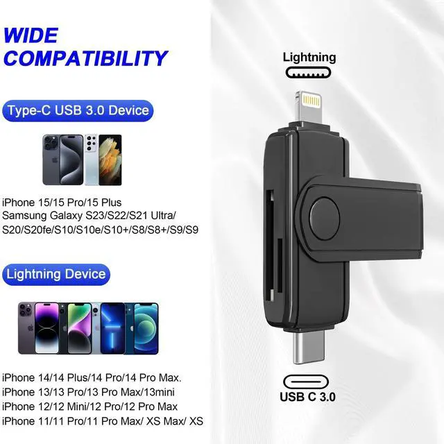 Dual Lightning & USB-C Connector : This iPhone SD card reader combines Lightning and USB-C 3.0 interfaces, making it compatible with different types of devices, such as iPhone 15/14/14 Pro/14 Pro Max/13/13 Mini/13 Pro/13 Pro Max/12 Mini/12/12 Pro/12 Pro Max/11/XR/XS/X/8/7/6/5, MacBook Pro/Air, iPad, and other USB-C-enabled devices. This versatility enables you to easily share and transfer data between different devices