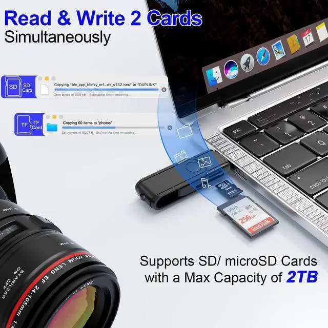 You can insert and read two SD or TF cards at the same time. This means you can read or transfer data on two cards in one operation, improving efficiency and convenience.