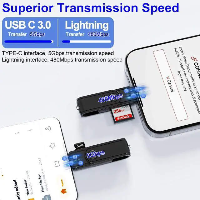 High-speed transfer: Although the Lightning interface has a transfer rate of 480Mbps, and the USB-C 3.0 interface can transfer up to 5Gbps. But no matter which interface you use, this card reader can provide fast data transfer speeds, allowing you to quickly transfer large amounts of data from the card to your computer or other devices