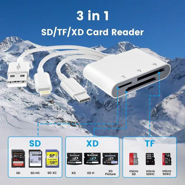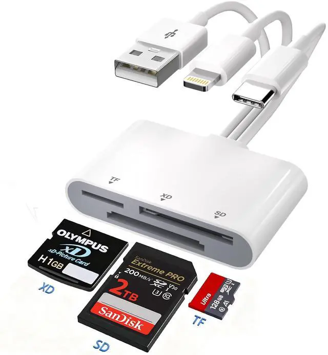 3-in-3 Lightning+USB A+USB C to XD/TF/SD Card Reader