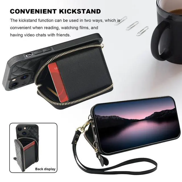 The attached adjustable shoulder strap can turn it into a crossbody handbag. And an anti-lost wristlet allows you to hang your phone in your hand.